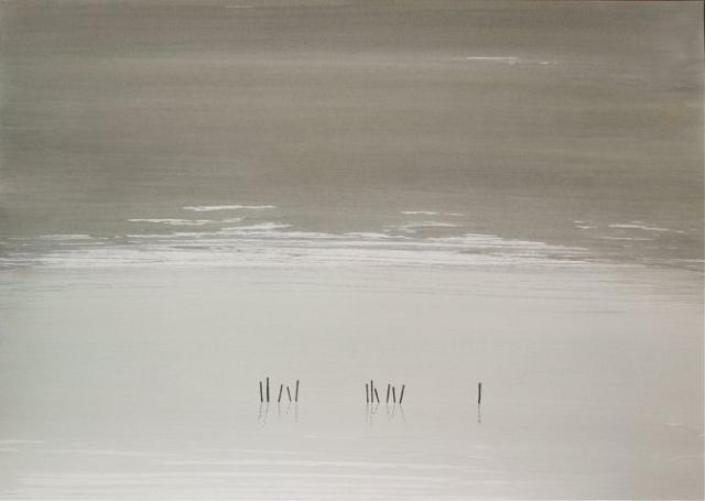 Quand je veux ancrer (pas fixer !) ma peinture, situer une micro présence dans l’infini présent, j’utilise le cinquième élément des chinois, le bois. Je dessine poteaux et arbres, qui donnent un sens, offrent un repère. Mais s’il faut savoir jeter l’ancre, il faut aussi pouvoir la lever pour appareiller vers l’inconnu. Un tableau « vide » (je ne parle pas des « monochromes », qui relèvent la plupart du temps de l’imposture) ne l’est que parce que nous ne savons pas lire le vide, c’est à dire le laisser nous remplir.