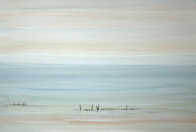 Je cherche en aquarelle l’immobilité vibrante, le silence parlant, quand l’écume de la vie se dépose et se dissipe, quand se découvrent le cœur du ciel pur et son reflet à la surface de l’eau. Alors tous deux, le ciel et la mer, s’appellent et se répondent, miroirs réciproques, images passagères de l’infini accordé au fini.