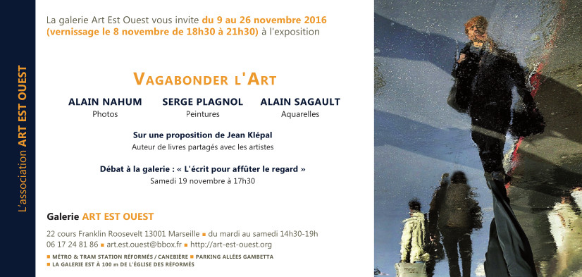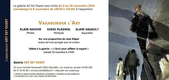 [1] Galerie Art Est-Ouest - 22 cours Franklin Roosevelt - 13001 Marseille, à une portée d’arquebuse de l’Église des Réformés. Exposition « Vagabonder l’Art », 8-26 novembre 2016.