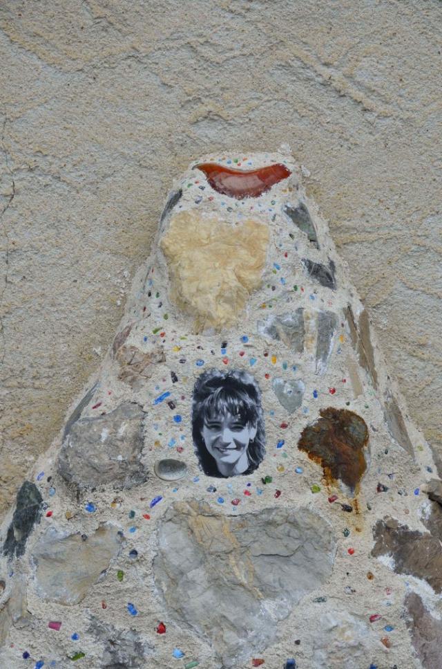 Une sorte de cairn où se rencontrent les cailloux-cœurs de notre amie Debbie, les fragments colorés des perles de verre que crée à Venise mon amie Muriel, le mortier d’Éric et la gravure de Thierry, pour enchâsser la photo d’elle que Bernadette voulait voir sur sa tombe, et quelques-uns des coquillages qu’elle aimait ramasser.